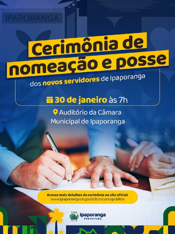 A solenidade acontecerá a partir das 7h, na Câmara Municipal de Ipaporanga. As informações completas sobre o processo podem ser consultadas na aba "Concurso Público", disponível no site oficial da Prefeitura de Ipaporanga.
