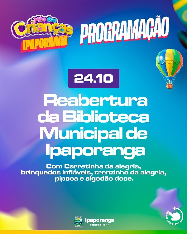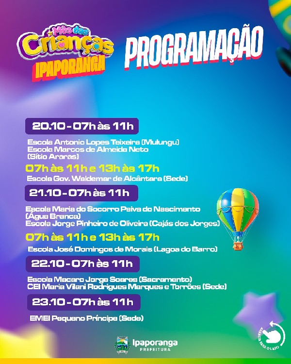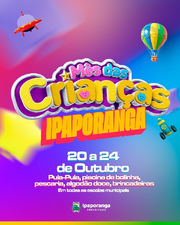 A alegria vai tomar conta de Ipaporanga! Em comemoração ao Mês das Crianças, a Prefeitura de Ipaporanga preparou uma programação especial que promete encantar os pequenos e transformar a semana em uma grande festa da infância.