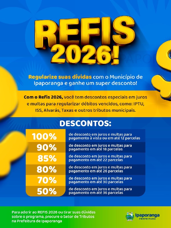A Prefeitura de Ipaporanga lançou o REFIS 2026, programa de recuperação fiscal que oferece condições especiais para a regularização de débitos municipais, com descontos em juros e multas.