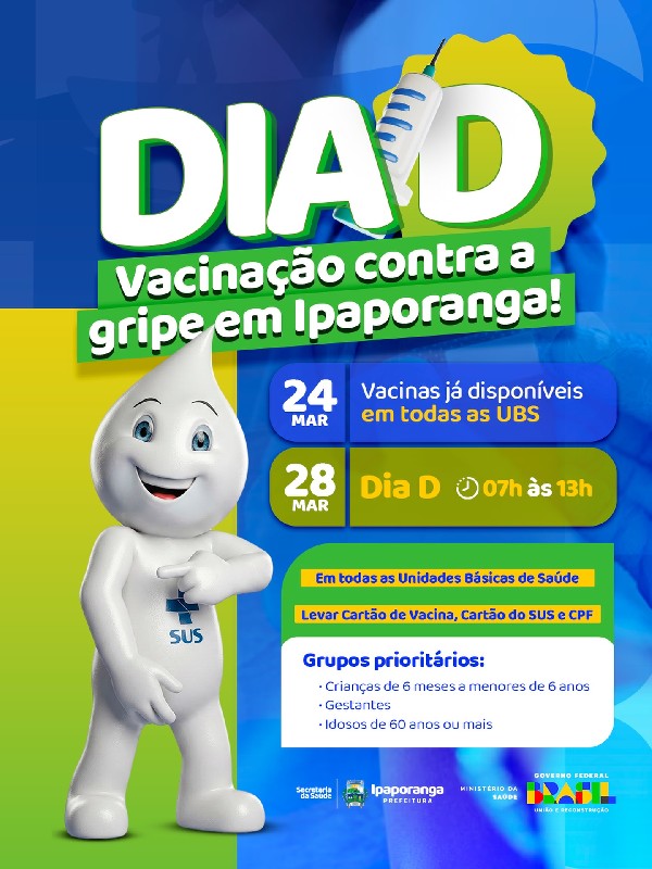 A Prefeitura de Ipaporanga informa que a Campanha Nacional de Vacinação contra a Gripe terá início no dia 24 de março. As doses estarão disponíveis em todas as unidades de saúde do município, priorizando inicialmente os grupos indicados pelo Ministério da Saúde.