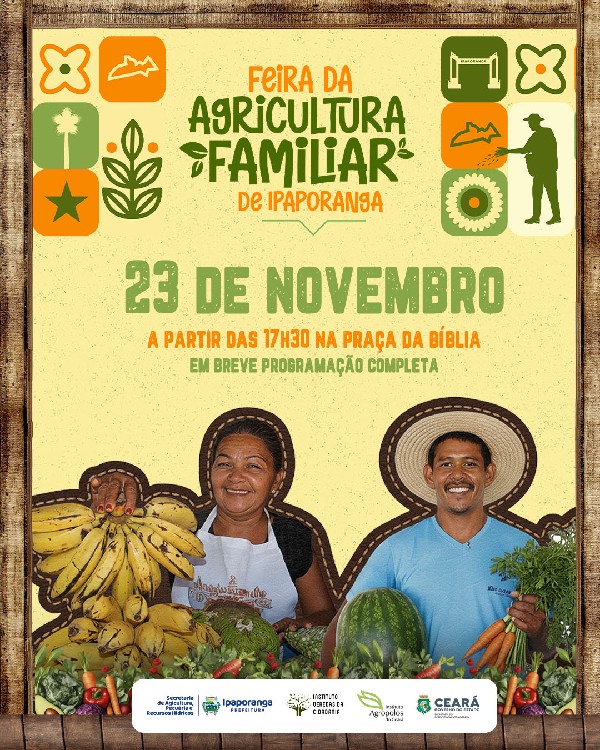 A Feira da Agricultura Familiar é uma realização da Prefeitura de Ipaporanga, Secretaria Municipal da Agricultura, Pecuária e Recursos Hídricos, Instituto Veredas da Cidadania, Instituto Agropolos do Ceará e Governo do Estado do Ceará!