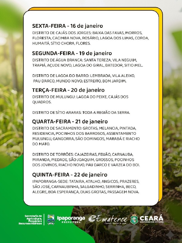 A entrega será realizada entre os dias 16 e 22 de janeiro, na Ematerce. Confira o calendário completo nos canais oficiais da Prefeitura de Ipaporanga.
